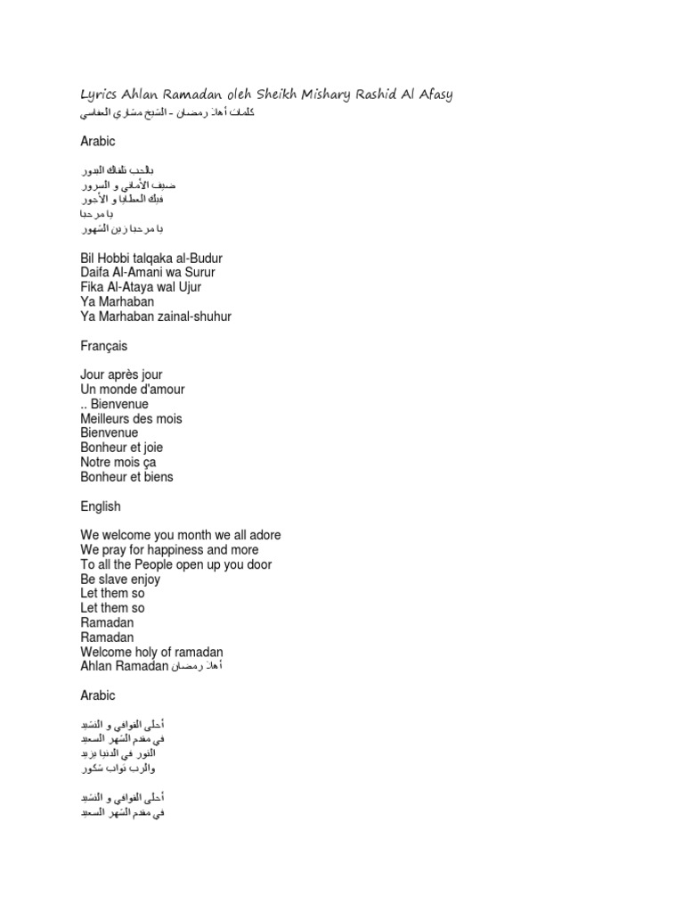 Lyrics Ahlan Ramadan Oleh Sheikh Mishary Rashid Al Afasy