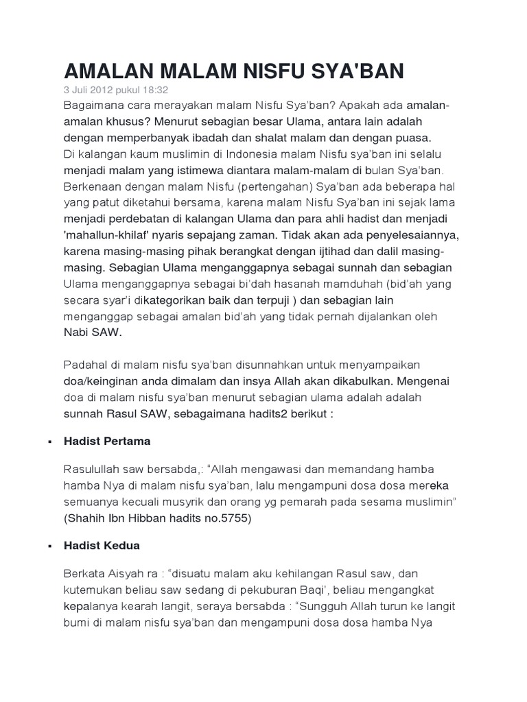 Sebuah hadits mengatakan bahwa nabi saw lebih sering puasa sunah di bulan syaban dibandingkan pada bulan lainnya hr al bukhari. Adapun untuk hadits tentang menghidupkan malam nishfu syaban tidak ada satu dalil shahih pun yang bisa dijadikan penguat untuk hadits yang lemah tadi at tahdzir minal bida 20 kedua ulama yang mengatakan tidak mengapa menghidupkan malam nishfu syaban dan menyebutkan bahwa ada sebagian tabiin yang menghidupkan malam. Rejab bulan allah syaban bulanku dan ramadan bulan umatku begitu juga semua hadis mengenai puasa bulan rejab dan solat pada malam malam tertentu dan malam nisfu syaban adalah dusta ke atas nabi saw kesemuanya adalah palsu.