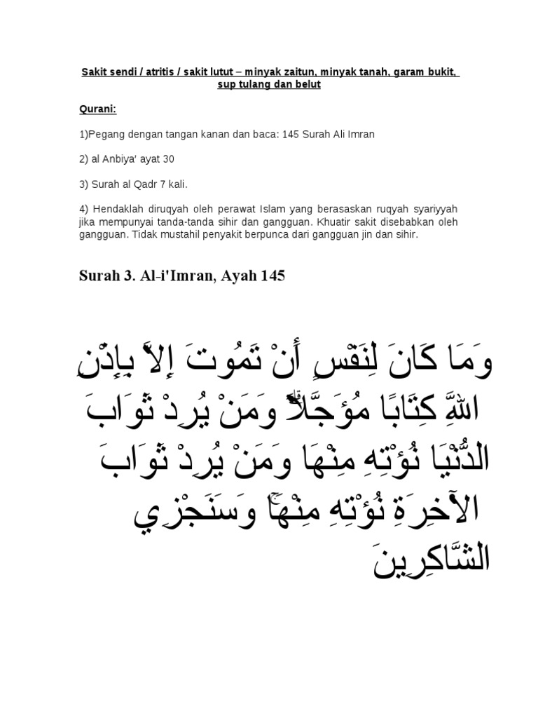 Sakit pada lutut adalah suatu kondisi yang diagnosisnya sulit dipastikan. Tips doa penyembuh s4kit lutut dan sendi menggunakan ayat suci al quran posted on january 26 2019 author admin comment0 apa itu sakit lutut at osteoarthritis oa. 1 satu sudu kapor sirih 2 satu biji limau nipis perah ambil airnya 3 satu sudu madu lebah 4 air gaul semua bahan bahan tadi dan sapu di tempat yang sakit kemdian dibalut sebelum tidur doa yang perlu dibaca.