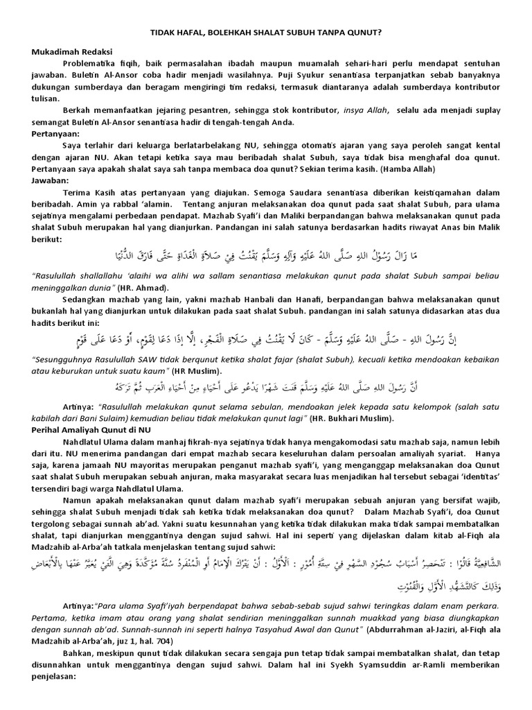 Tidak Hafal Bolehkah Shalat Subuh Tanpa Qunut Mukadimah Redaksi