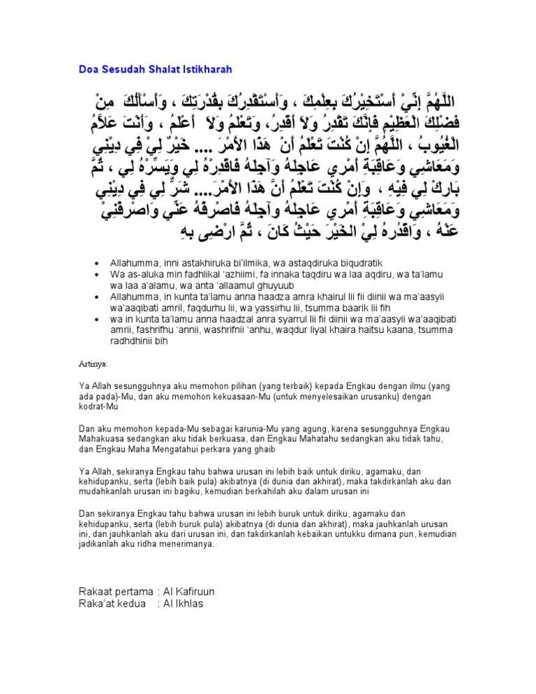 Setelah melaksanakan sholat istikharah tibalah anda untuk berdoa dan memohon petunjuk dari allah agar anda diberi kemantapan hati untuk dapat memilih segala sesuatu hal yang berat dalam hidup anda. Pilihan antara yang baik dan yang buruk jalan yang benar atau jalan yang sesat. Doa setelah shalat istikharah lengkap dengan latin dan artinya bacaan doa shalat istikharah shalat istikharah ialah shalat yang dikerjakan untuk meminta petunjuk kepada allah swt dikarenakan sedang bingung diantara beberapa pilihan dan merasa ragu untuk memilih atau bingung untuk memutuskan sesuatu hal tersebut.