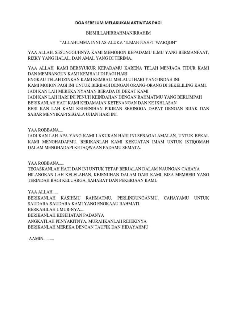 Doa sebelum aktivitas. Doa pagi sebenarnya tidaklah sulit. Baik itu persoalan rezeki yang berbeda beda di setiap orangnya. Sebelum engkau melakukan aktivitas bekerja sebaiknya engkau berdoa dahulu agar aktivitas kerja anda selalu dilindungi dan dijaga oleh allah subhanahu wa taala.